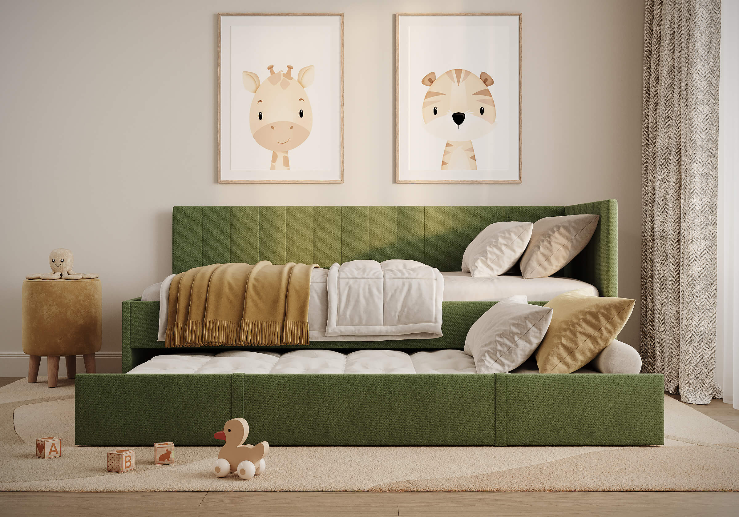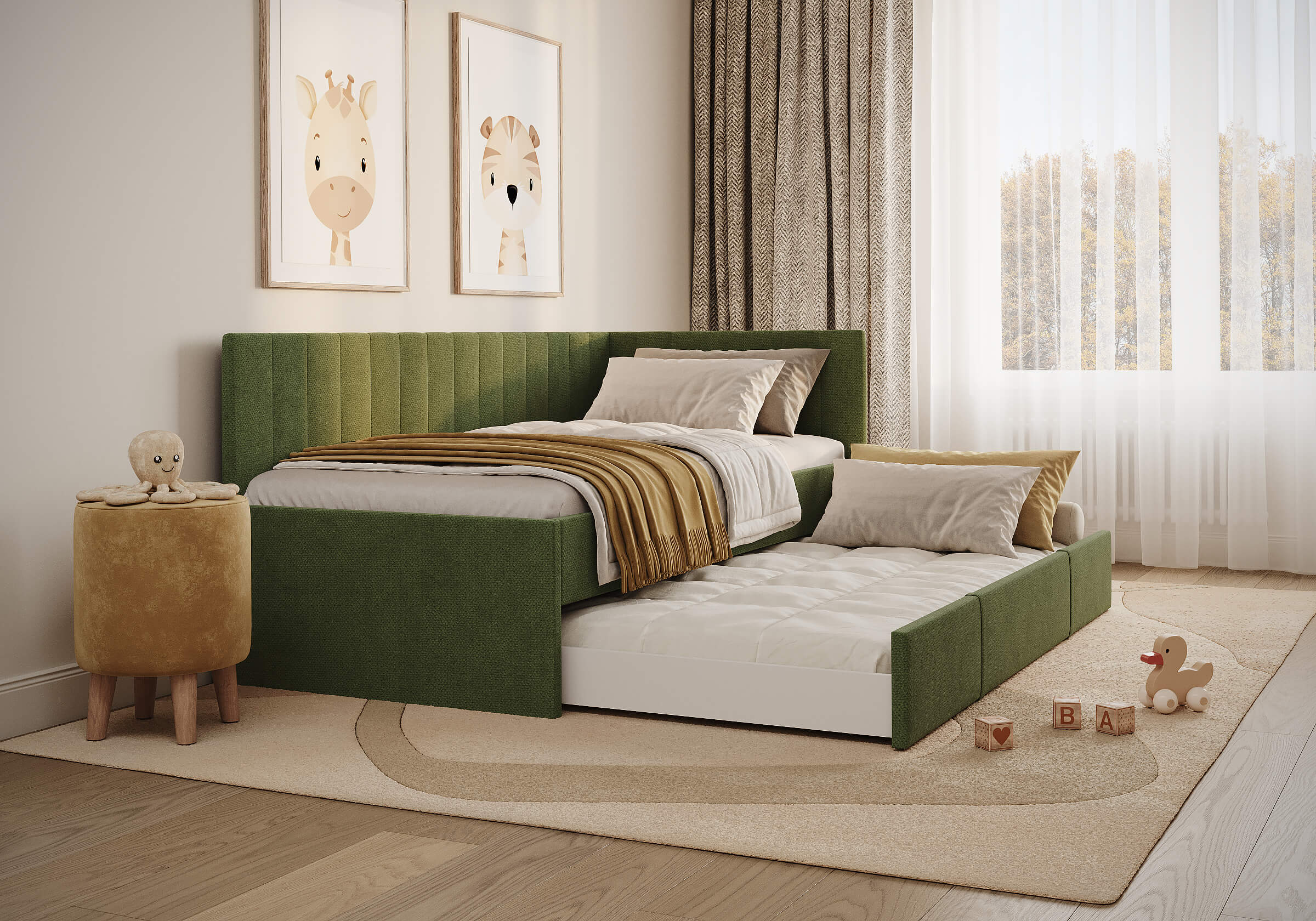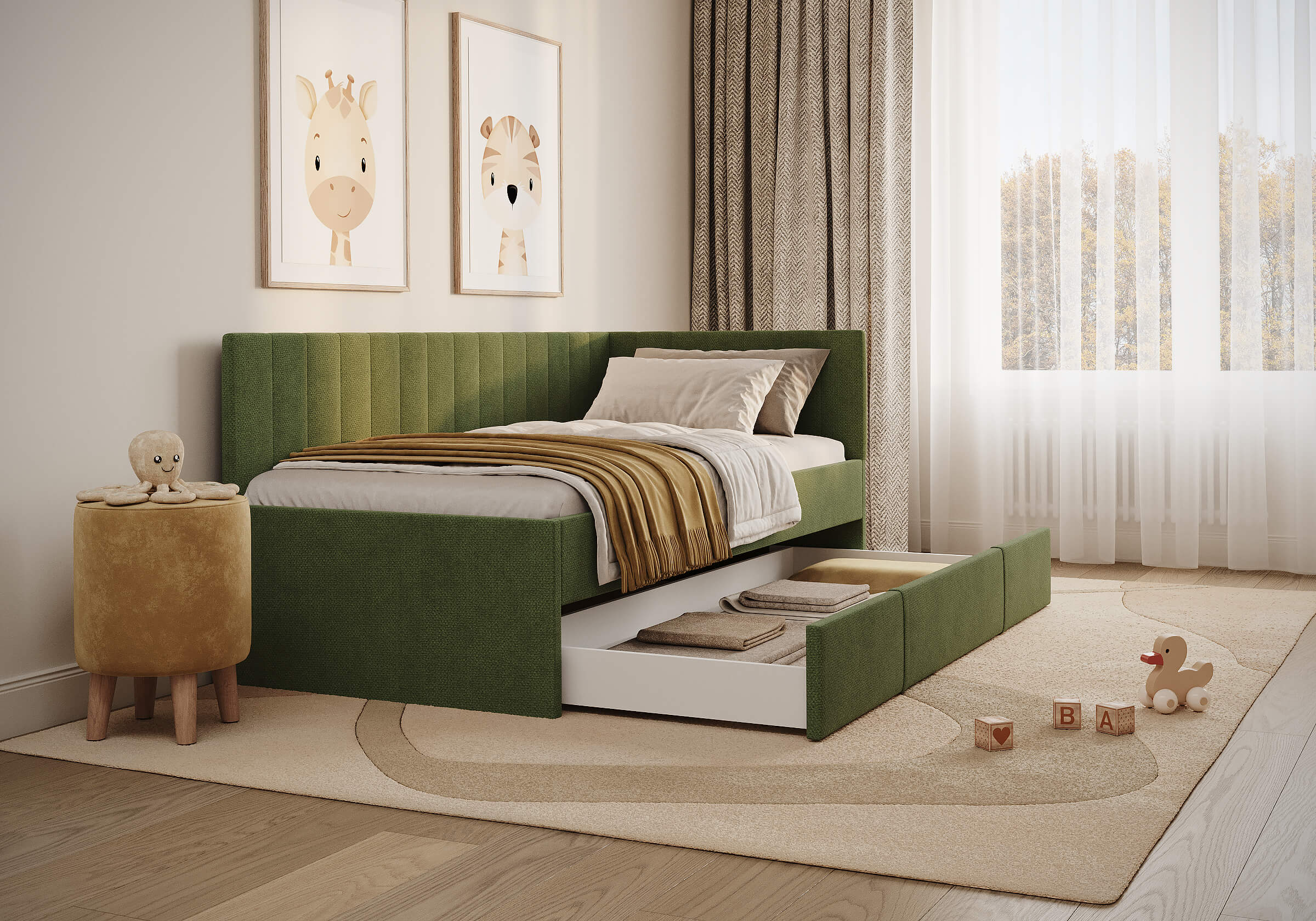 Современная детская кровать — воплощение удобства и яркого дизайна. Универсальный подлокотник устанавливается как с левой, так и с правой стороны — подстраивается под любую комнату. Выдвижной ящик легко превращается во второе спальное место или вместительный короб для хранения игрушек и белья. Идеальное решение для комфортного сна и экономии пространства.
